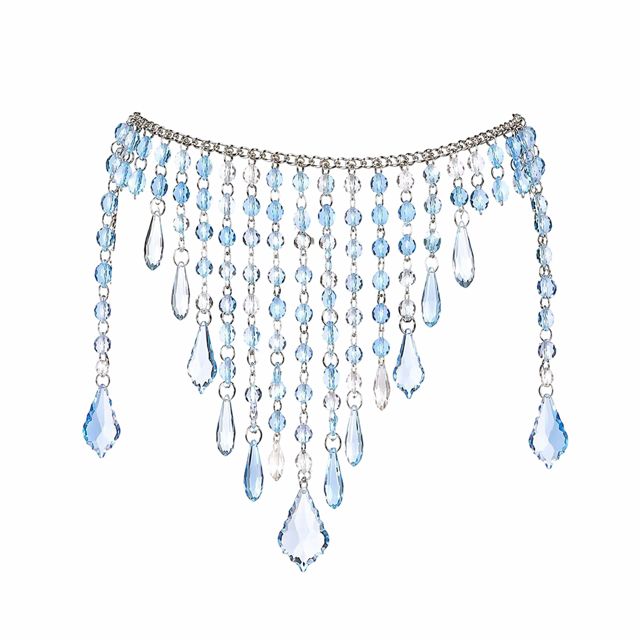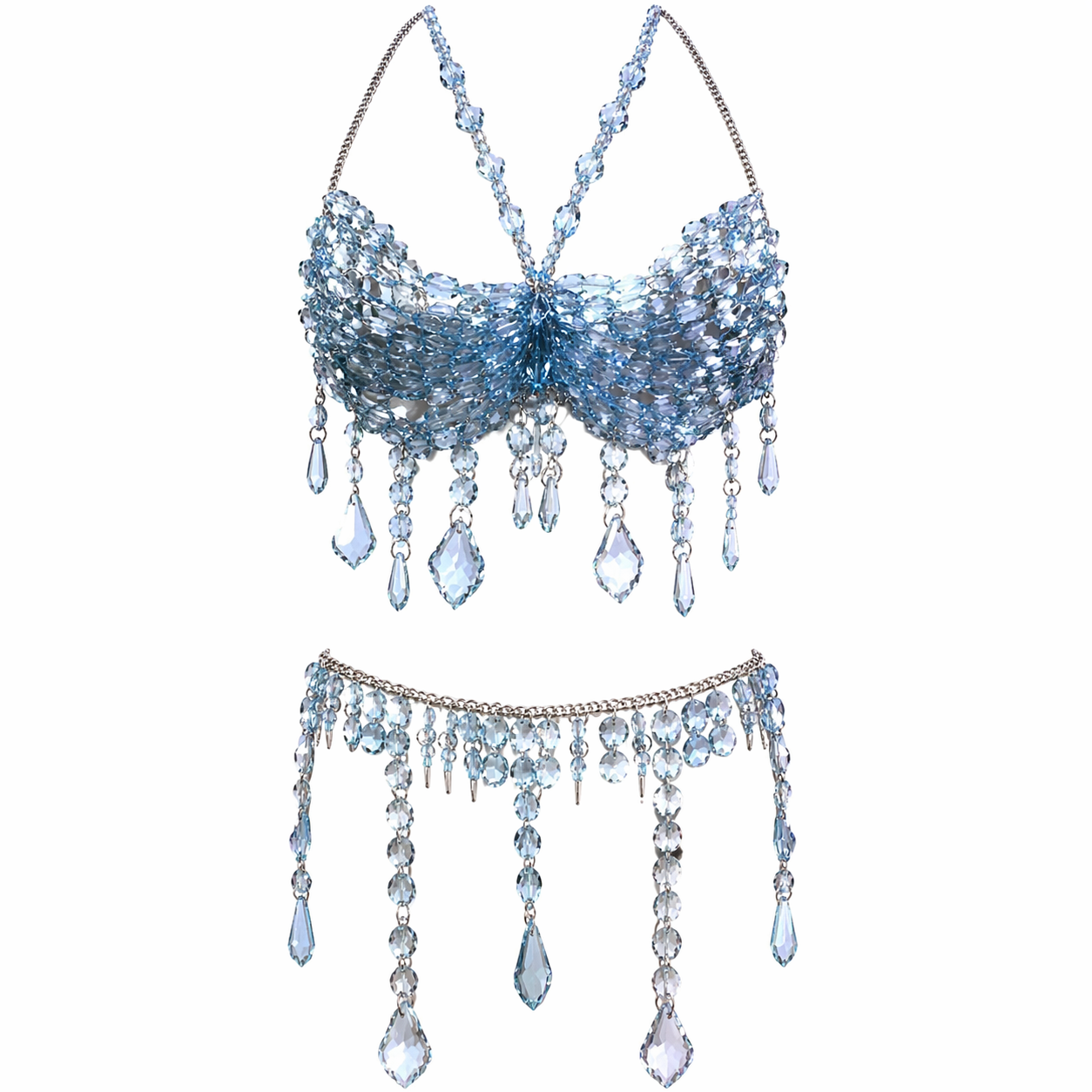 This statement set features cascading sapphire-toned crystals, delicate chain detailing, and fluid movement that catches light from every angle—creating a luminous, water-like glow on the body.