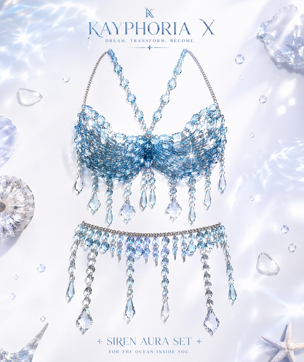 Step into the Kayphoria Dreamverse with the Siren Aura Set – Sapphire Dream, a crystal-embellished harness and body chain designed to transform your presence into pure energy.